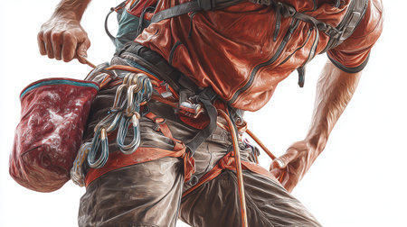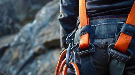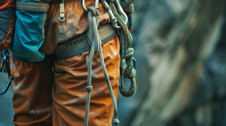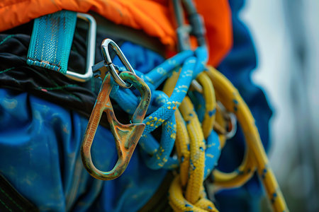 close-up of climbing harness, with ropes and carabiners visible, created with generative ai
