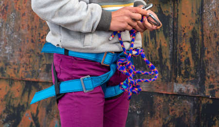 A rock climber prepares equipment for climbing, a woman holds a rope and a carabiner in her hands, carabiners and quickdraws on the climber's harness
