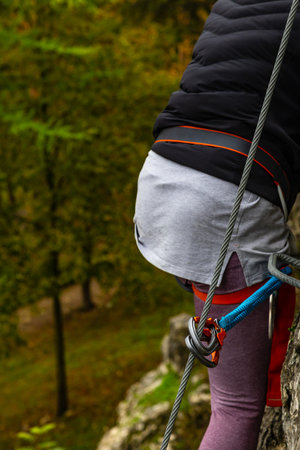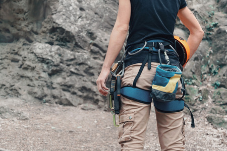 Unrecognizable woman rock climber wearing in safety harness with climbing equipment and helmet outdoor