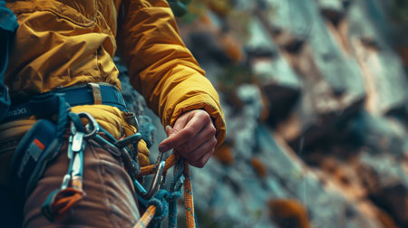 Close-up of climber with climbing equipment, tying knot on climbing harness, preparing for climbing.