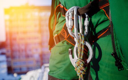 Close up of Work on high-altitude equipment. Fall arrest device for worker with safety belt hooks