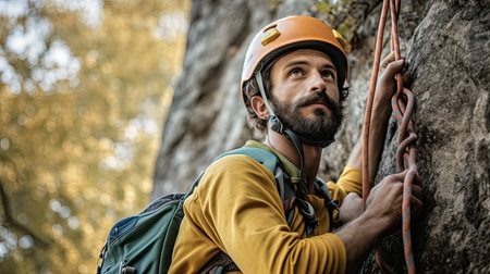 Climber ascends steep rock face, equipped with safety ropes harness image, ai generated. Autumn foliage. Challenging outdoor photography scene wallpaper. Persistence concept photorealistic photo
