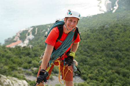 rock climber scales challenging and vertical wall, with ropes and gear visible, created with generative ai