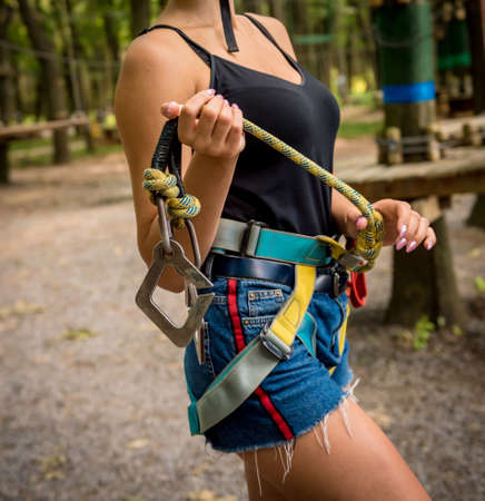 Close-up of safety equipment for climbers weared on the woman with climbing wall on the background