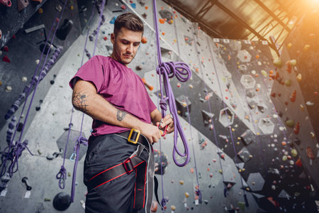Rock wall climber wearing safety harness and climbing equipment indoor, close-up image