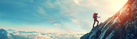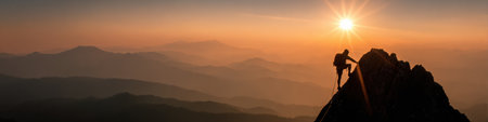 A climber triumphantly arrives at the mountain peak as the sun rises, representing success over challenges in nature.