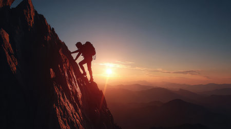 A mountain climber reaches the summit as the sun rises, showcasing determination and the triumph of overcoming obstacles in nature.