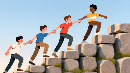 People helping each other hike up a mountain , illustration