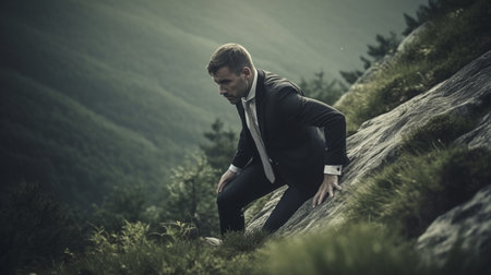 A person climbs a mountain overcoming obstacles to reach the summit created with Generative AI