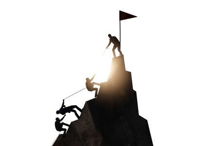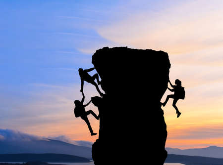 Concept of teamwork with team climbing mountain