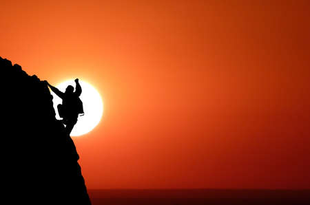 The man was climbing to the top of the mountain with a beautiful light effort. Silhouette of man climbing up steep edge of mountain. Fit young determined man climbing to top of mountain. People Never giving up, strength and power.
