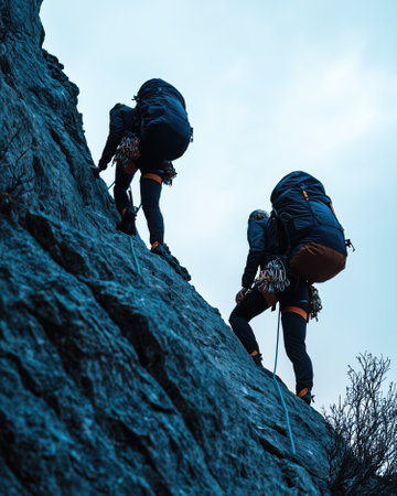 Two equipped rock climbers ascending challenging vertical rocky wall. Generative AI