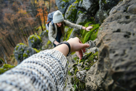 A cheerful young man with a stylish beard and tousled hair is climbing a rocky terrain, extending his hand towards the camera with a bright smile. His enthusiasm and adventurous spirit shine through as he embraces the thrill of the outdoors, showcasing the joy of exploration and connection with nature.