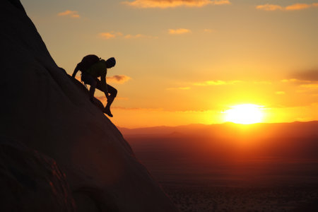 A dedicated climber makes a bold ascent on a rocky formation, framed by a stunning sunset that paints the landscape in warm hues, symbolizing adventure and determination.