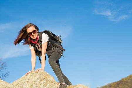 Woman hiker with backpack is climbing in rocky mountain. Focus on the shoe