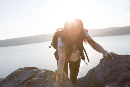 Athletic young woman in sportswear climbing rocks outdoors
