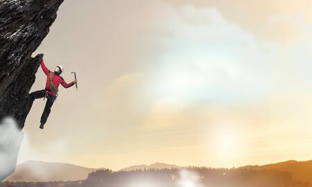 Rock climber climbing high rock wall extreme sports outside, alpinism equipment