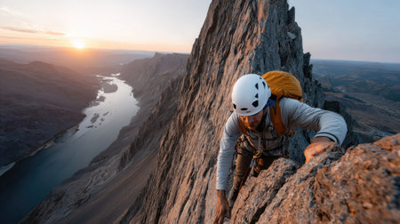 An experienced climber scales a challenging rock formation as the sun rises, illuminating the stunning landscape and river below, showcasing adventure and determination.