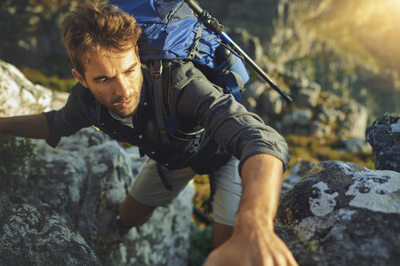 Nothing teaches you to persevere like hiking. a young man hiking up a mountain.
