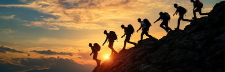 Conquering New Heights Together: Adventurous Hikers Scaling a Majestic Mountain at Dusk