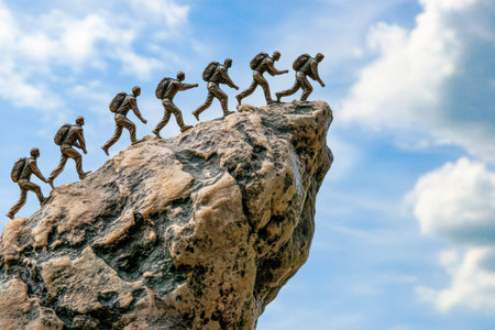 A captivating scene featuring miniature hikers climbing a rocky summit. This image symbolizes adventure, perseverance, and the values of determination and teamwork.