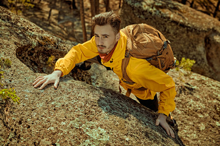 A handsome caucasian man is trying to climb a rock to the top of the mountain during vacation trips. Concept of trying to focus on goals and success.