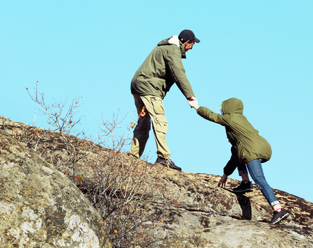 A man helps his friend to climb to the top. Hiker gives a hand to pull up the on mountain.