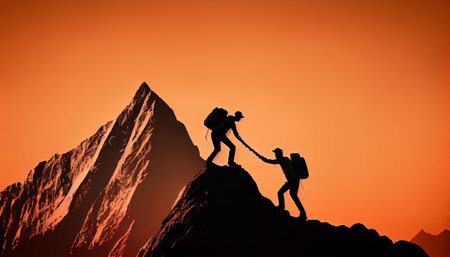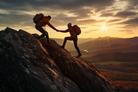 Generative AI : Couple of hikers helping each other climbing a mountain at sunset People giving a helping hand and active sport concept