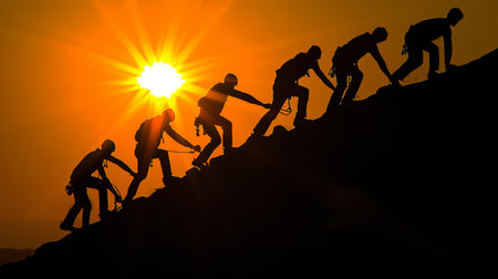 A dramatic scene of a team of climbers helping each other reach the summit at sunrise.