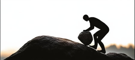 Silhouette Figure Pushing Boulder Up Hill, Symbolizing Persistence, Determination, and Hard Work