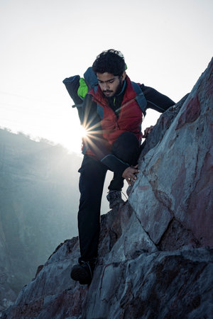 young indian climber and traveler climbing up the mountain rock during sunset. Adventure and sports concept.