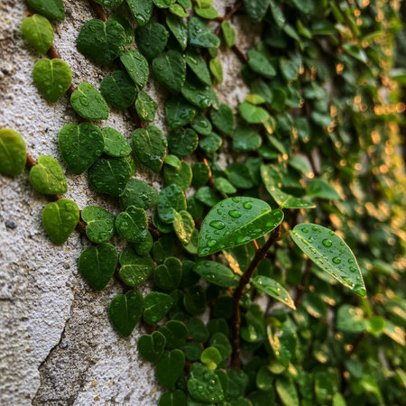 Green Creeper Plant on the Wall with Water Drops, Nature Background