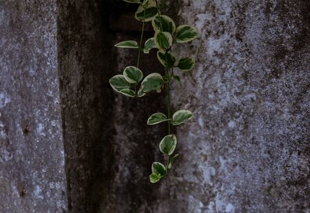 Lush curly ivy throughout the year. Leaves along the wall side, background wall, cement. Copy space. Ivy gourd .