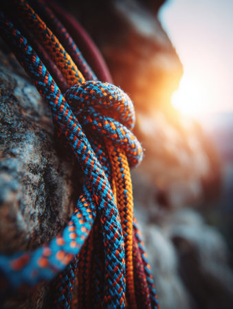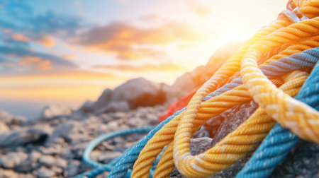 A Colorful climbing ropes resting on rocky terrain during beautiful sunset