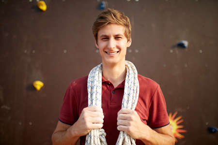 Active young man in sportswear standing with rope on shoulders against artificial training climbing wall. Smiling climber with cord, harness, carabiners and equipment looks to the camera outdoors.