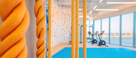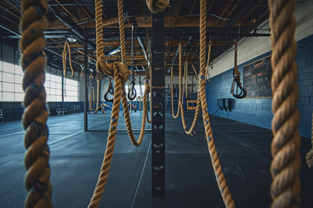 A photo depicting a gym with ropes hanging from the ceiling, providing a setting for athletic training and exercise, Inside a CrossFit gym with rope climbs and cargo nets, AI Generated