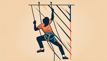 A climber is seen scaling a colorful wall with ropes and a harness in a playful and minimalist illustration depicting the thrill of rock climbing