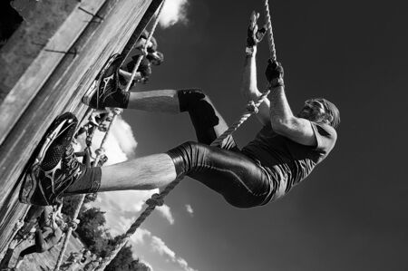 young man climbing on a rope during a competition