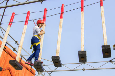 A girl passes an obstacle in a rope town. A girl in a forest rope park.