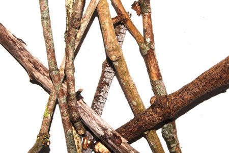 Small natural fallen tree twigs sticks and branches on a white background