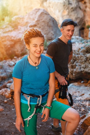Couple of young climbers in the cave, active life and relationship concept - stock image