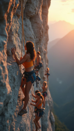 Five climbers skillfully navigate a vertical rock face, showcasing teamwork and adventure in an outdoor climbing expedition