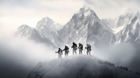 Synergy fuels a groups ascent, teamwork etching paths to the lofty summit