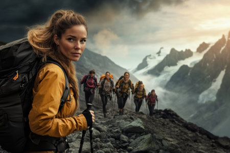 Confident female hiker leads friends group on mountainous trail portrait image, ai generated. Ready for adventure photography. Nature enthusiasts picture photorealistic. Wanderlust concept photo