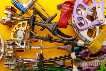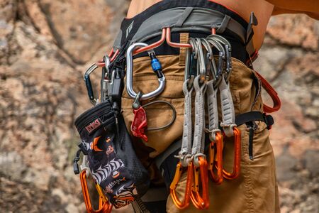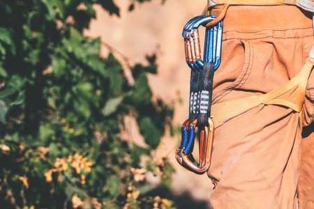 A closeup and detailed view of professional rock climbing equipment secured to the belt of a climber, various size clamps and belay devices for safety