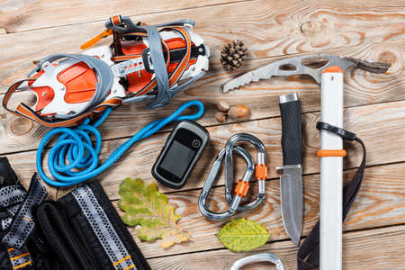 Equipment for mountaineering and hiking on wooden background.
