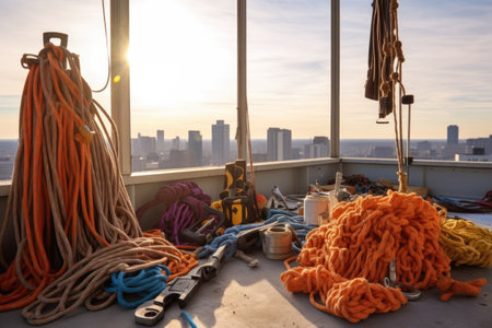 climbing gear and ropes on skyscraper rooftop, created with generative ai