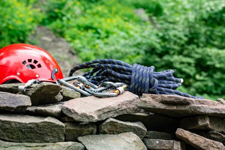 Rope access tools: hard hat, rope, carabiner. Mountaineering equipment on rocks against a background of rocks and greenery