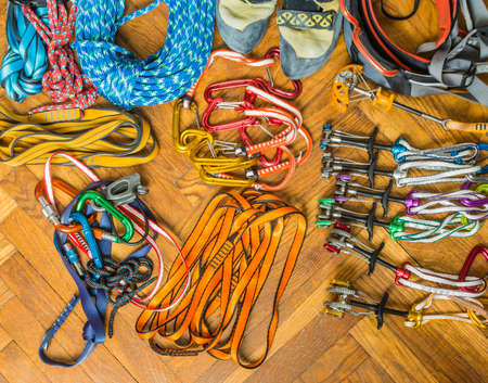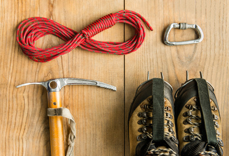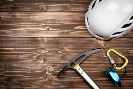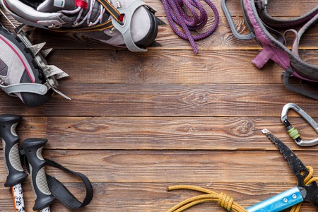 Climbing equipment on wooden background