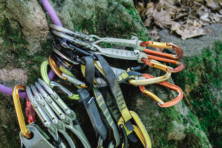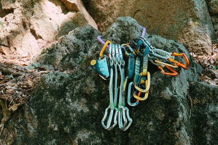 Mountaineering equipment hanging on the rocks. Quickdraws set, belay device, rope. close up
